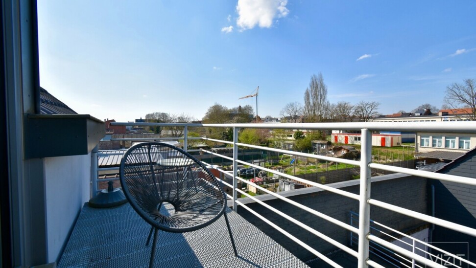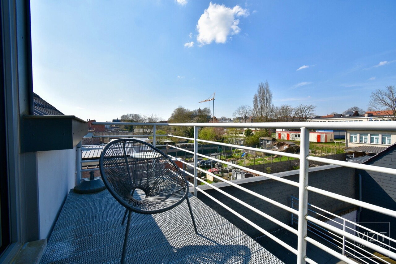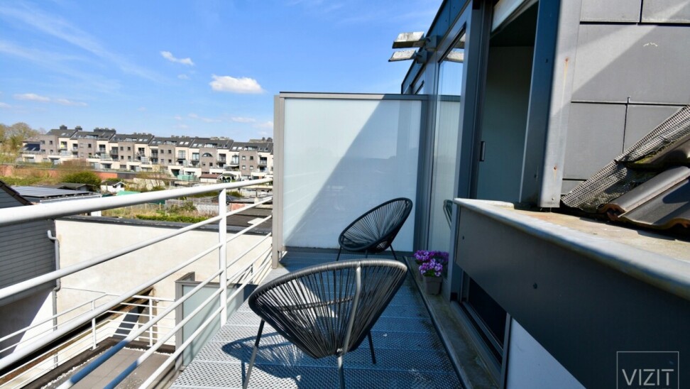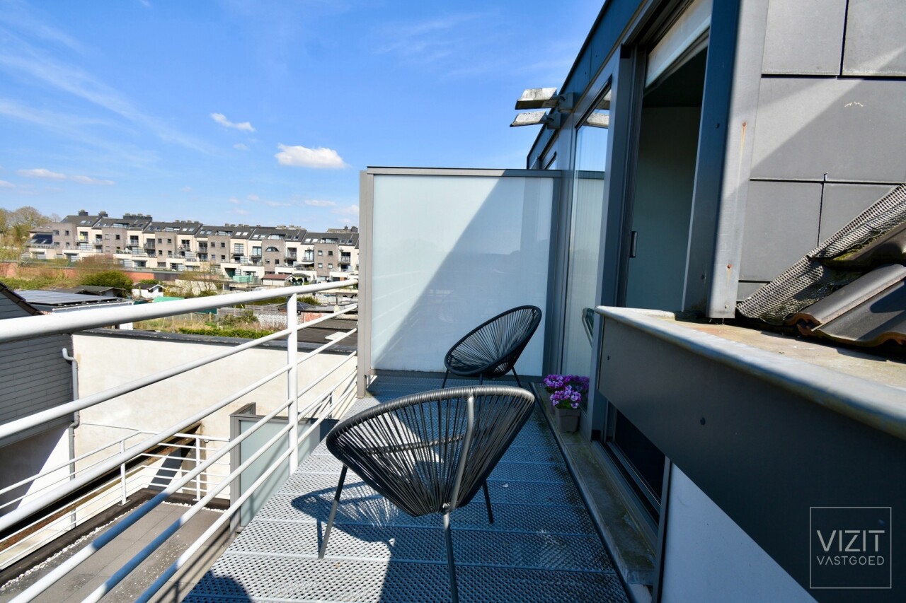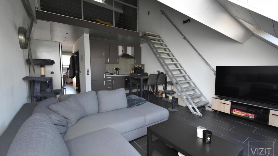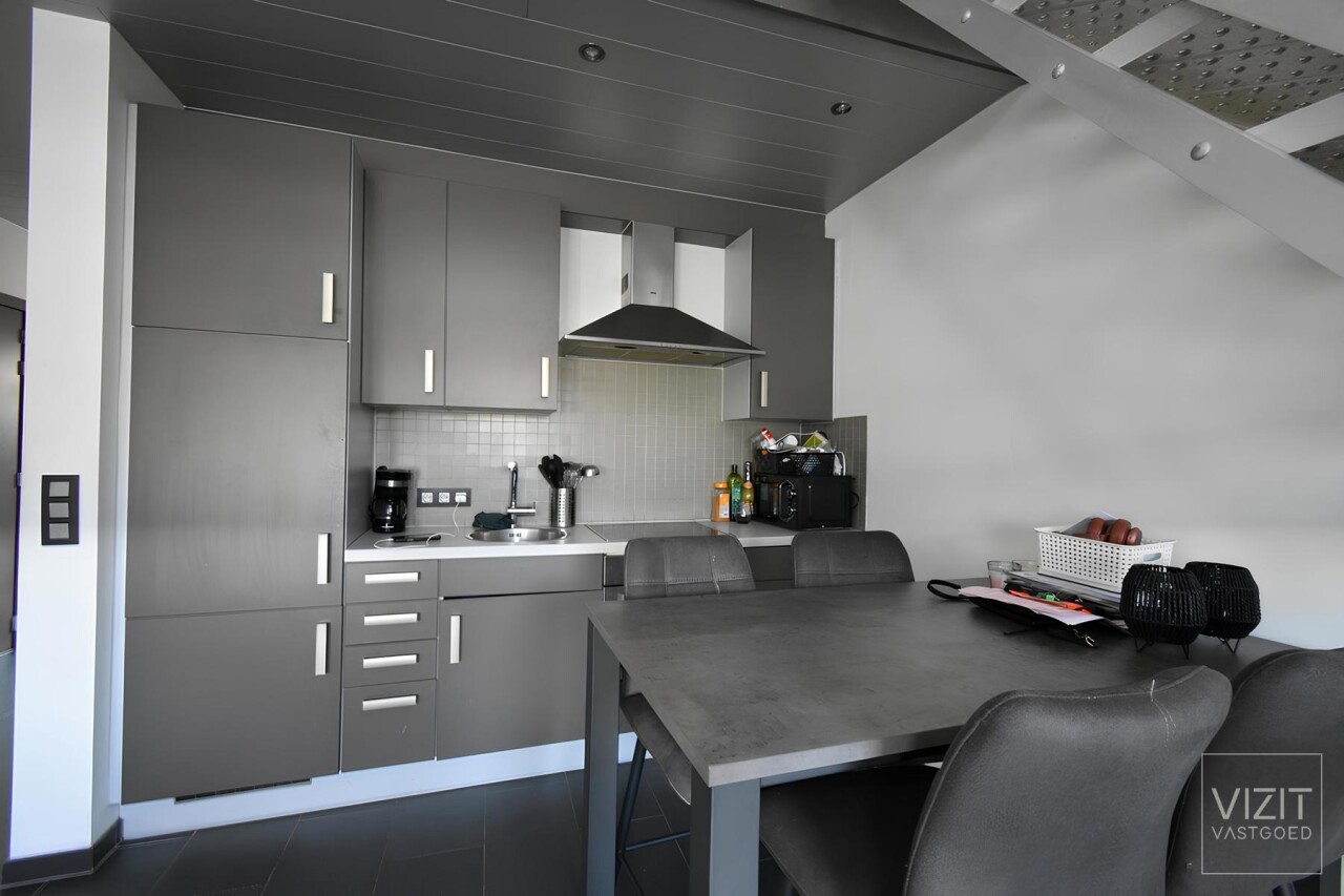 Op de tweede verdieping, bereikbaar via trap, geen lift, omvat het appartement een inkomhal, een dressingruimte ingemaakte kasten die ook dienst kan doen als logeerkamer, een open ingerichte keuken met Zanussi-toestellen en een lichtrijke leefruimte met toegang tot het terras. De badkamer is uitgerust met een douche, bad, wastafelmeubel en hangtoilet. De mezzanine-slaapkamer maakt van het appartement een leuk en gezellig geheel.