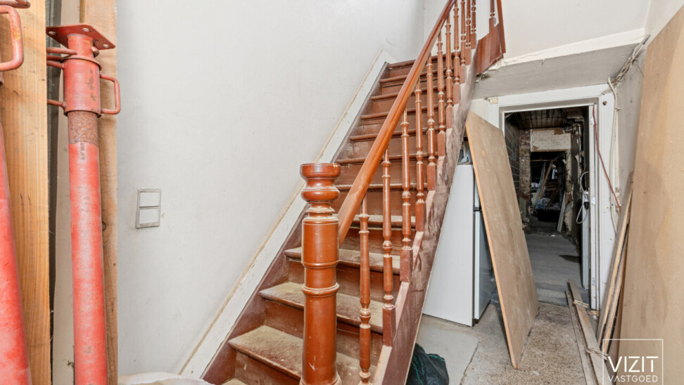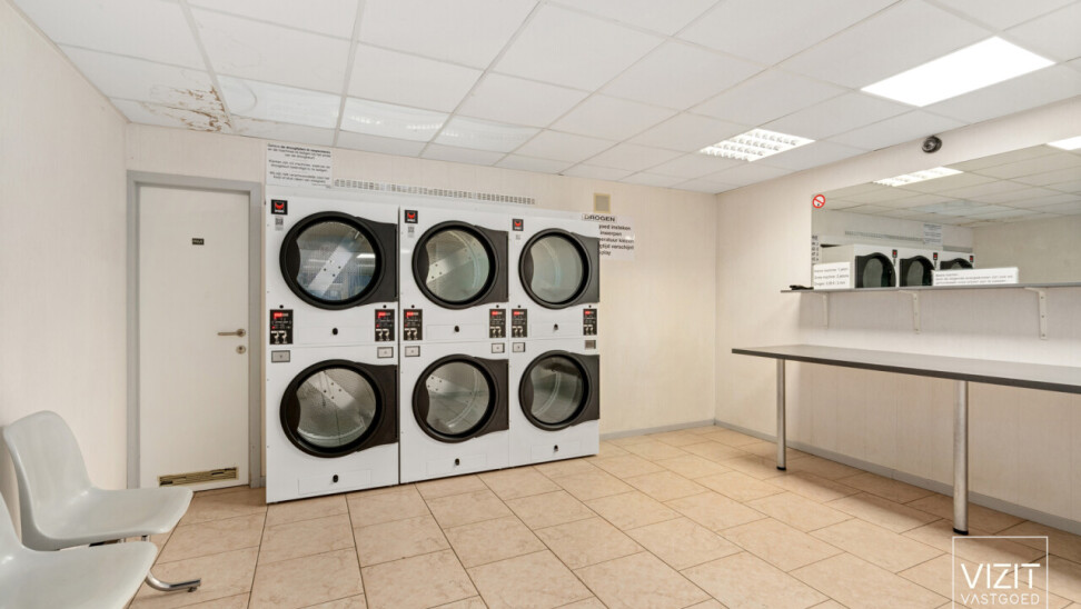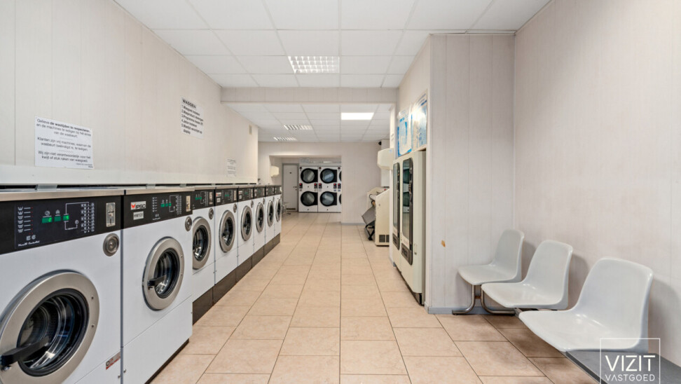 Het gelijkvloers omvat de wasserette met technische ruimten en een grote opslagzone, terwijl via een aparte inkomhal een trap toegang geeft tot de eerste en tweede verdieping, waar telkens een casco-ruimte van ongeveer 60 m² aanwezig is. Achteraan is er een kleine stadstuin.