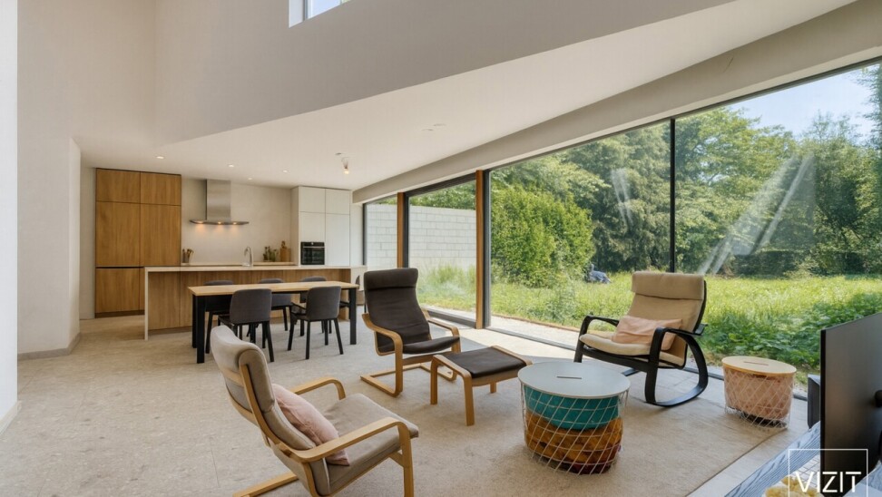 De inkomhal met gastentoilet geeft toegang tot een wasplaats met douche, berging en een ruime leefruimte met open keuken, verzonken zithoek en wintertuin. Aansluitend bevindt zich ook een bijkeuken.