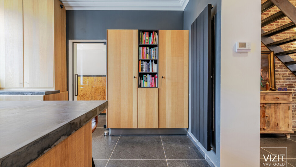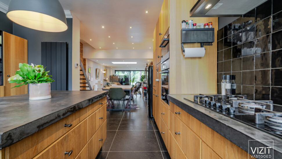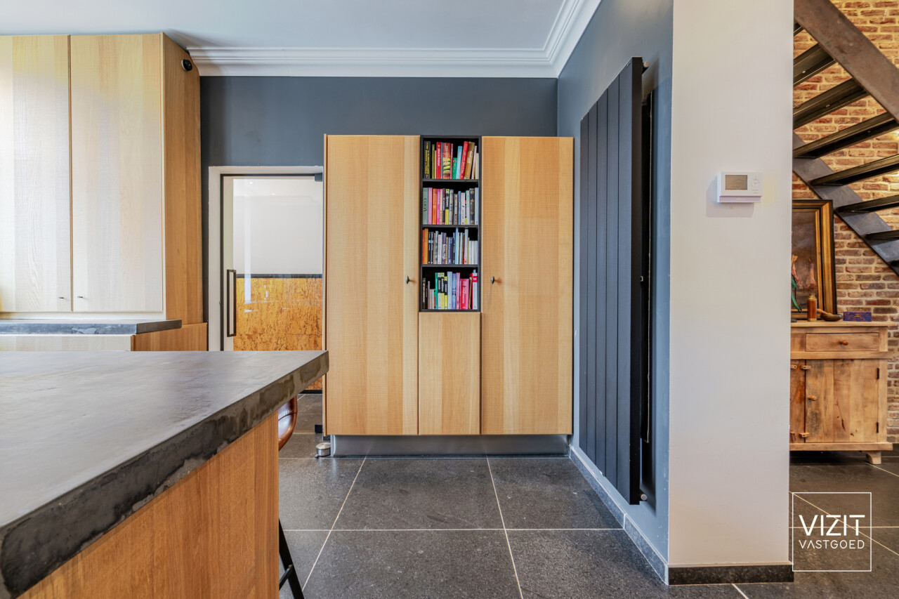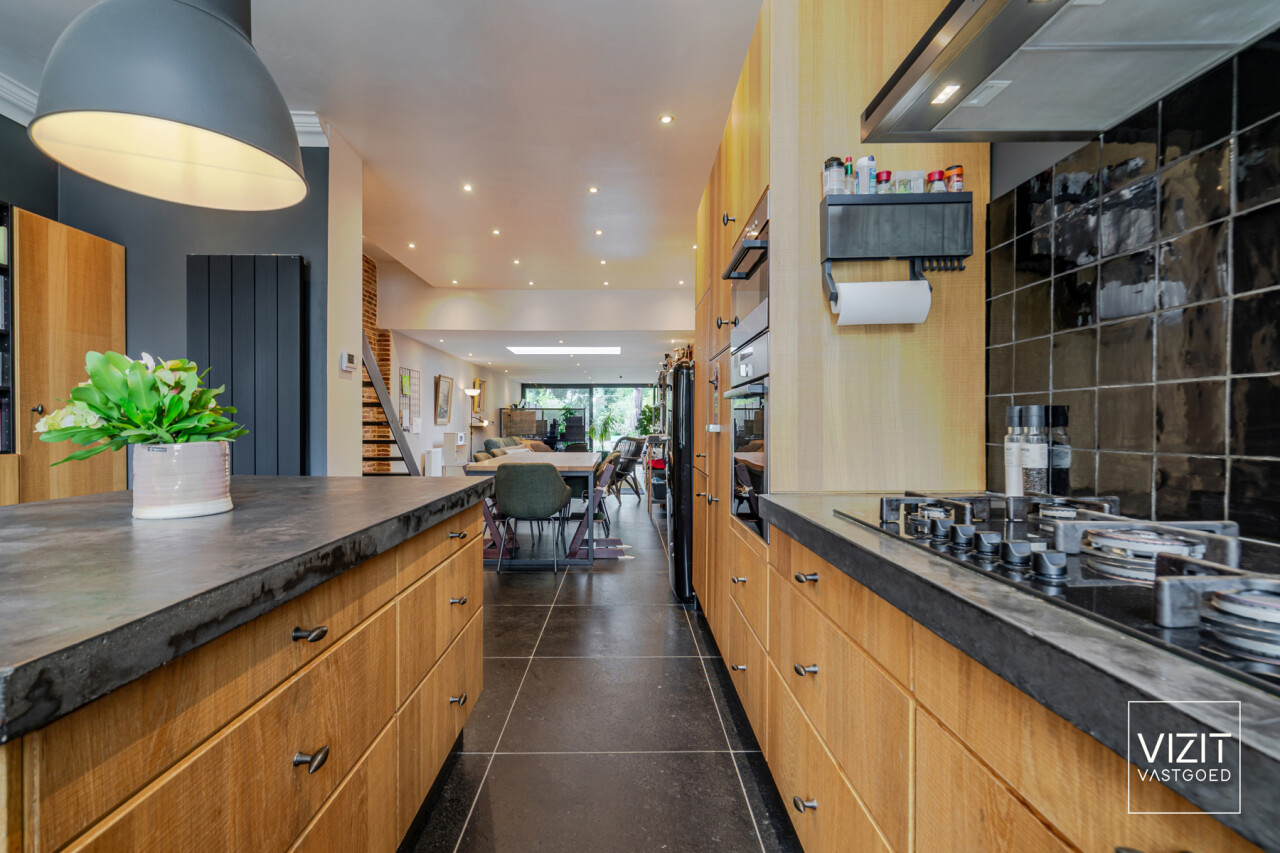 Via de inkomhal met gastentoilet komen we in de volledig uitgeruste keuken (18 m²). Aansluitend bevindt zich de lichtrijke leefruimte (50 m²) met zicht op de tuin.