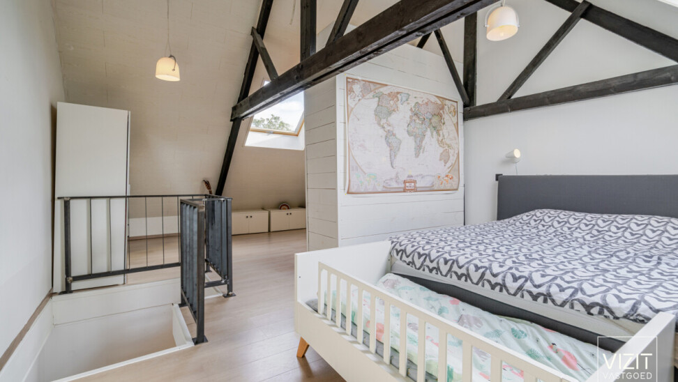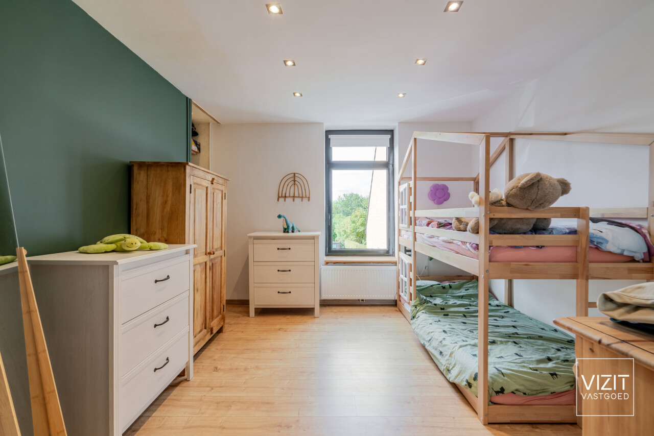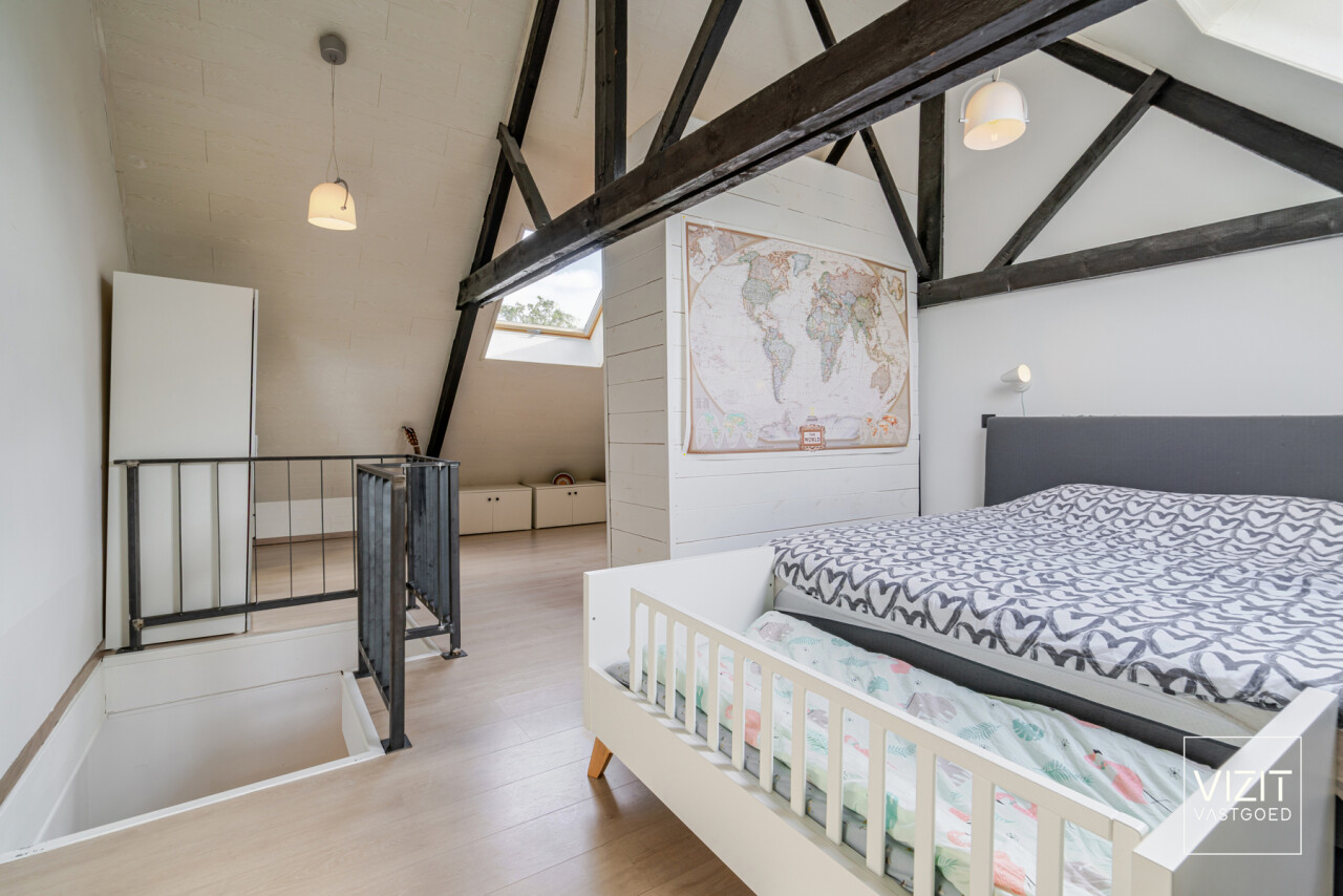 Op de eerste verdieping vinden we een ruime badkamer, een comfortabele slaapkamer en een praktische wasplaats. De tweede, zeer ruime slaapkamer (35 m²) bevindt zich op de dakverdieping. Buiten geniet u van een gezellig zonneterras (20 m²) en een onderhoudsvriendelijke tuin met achteraan een tuinberging (18 m²).
