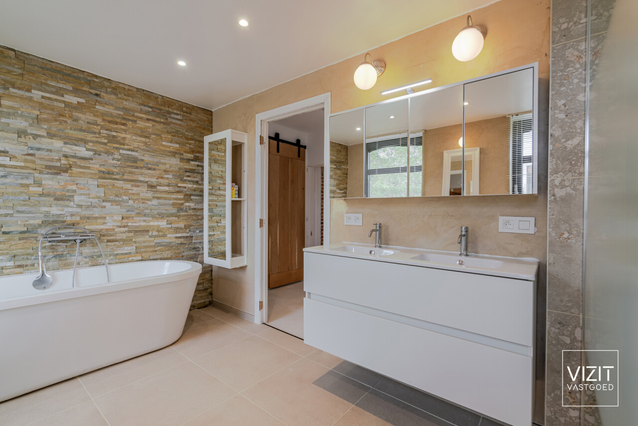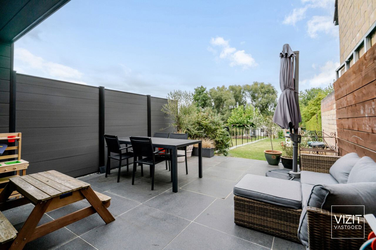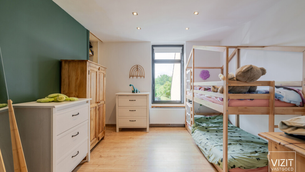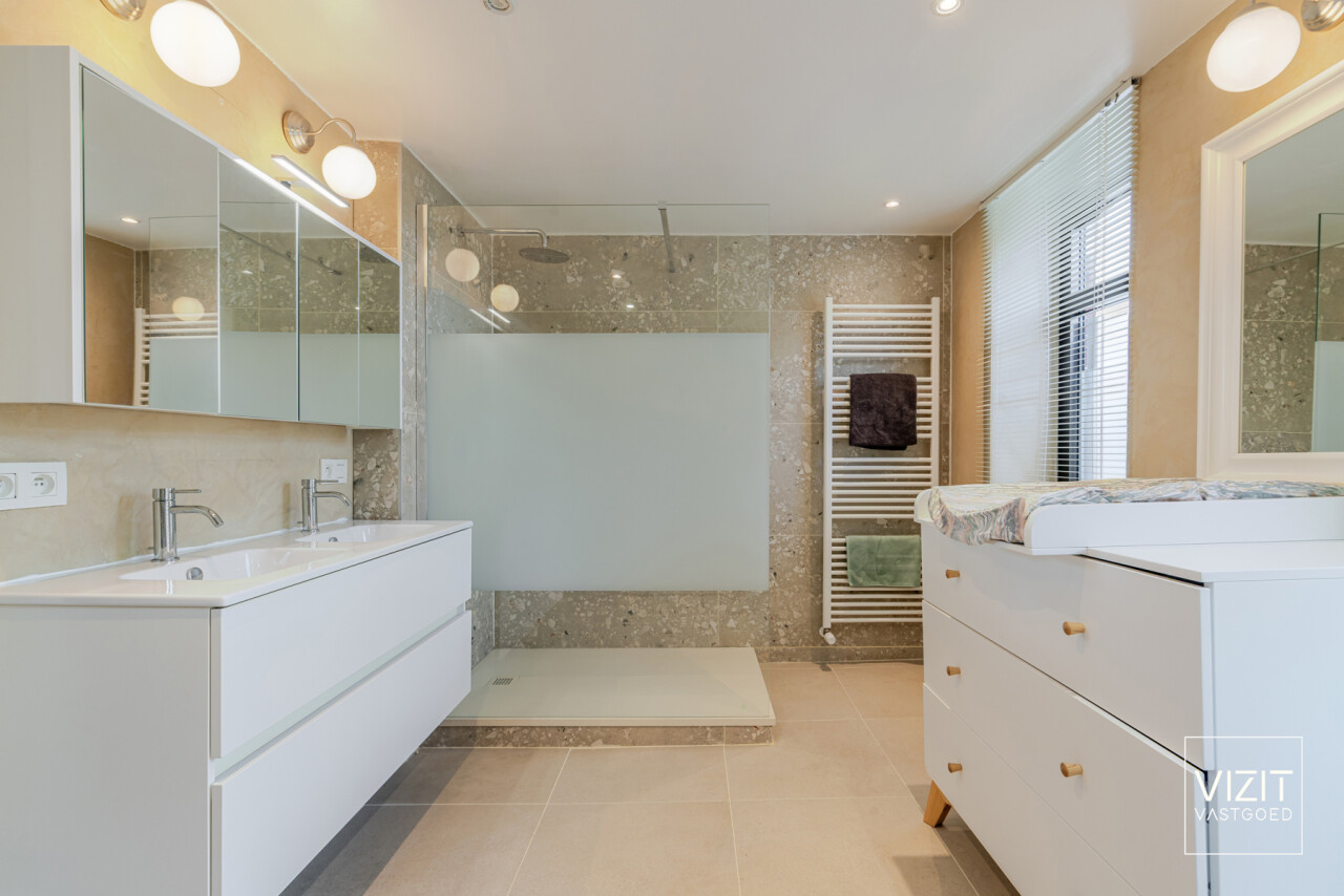 Op de eerste verdieping vinden we een ruime badkamer, een comfortabele slaapkamer en een praktische wasplaats. De tweede, zeer ruime slaapkamer (35 m²) bevindt zich op de dakverdieping. Buiten geniet u van een gezellig zonneterras (20 m²) en een onderhoudsvriendelijke tuin met achteraan een tuinberging (18 m²).
