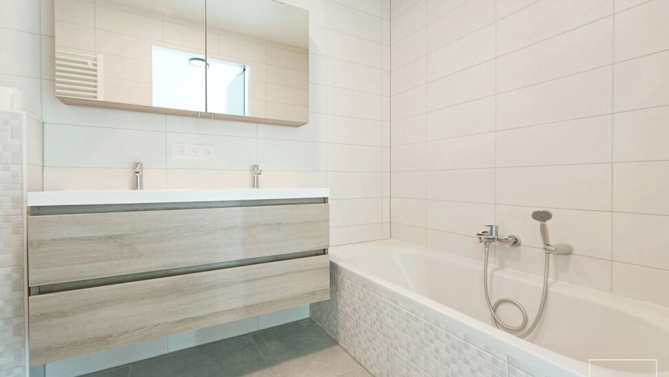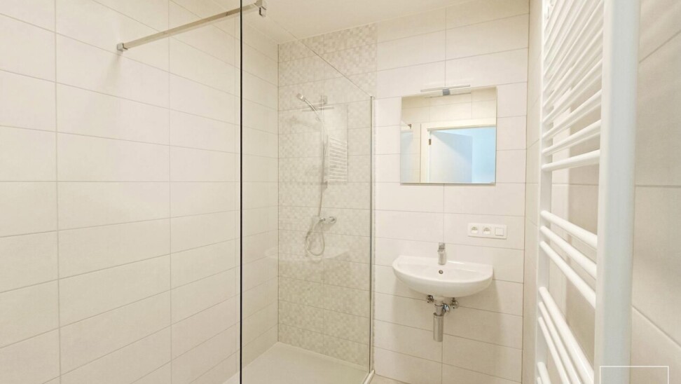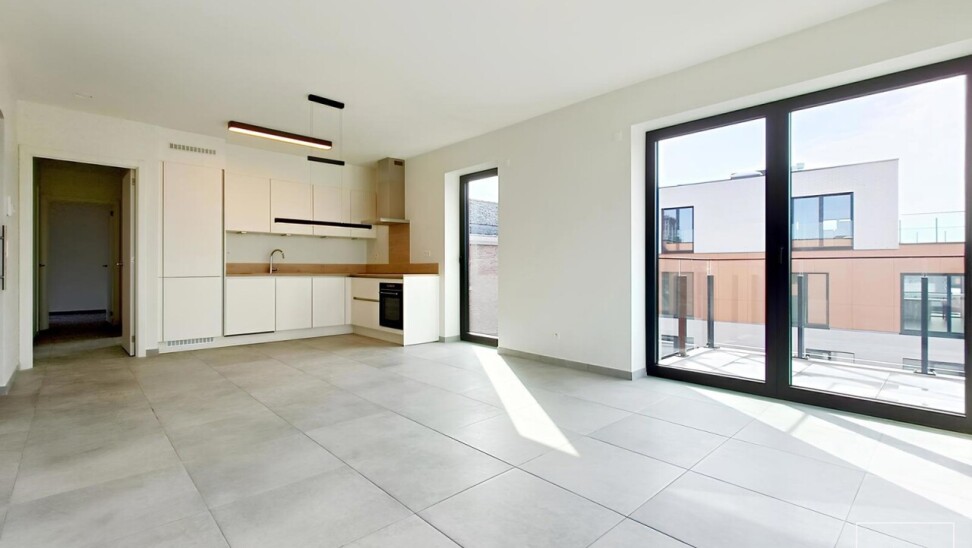 Het appartement omvat een inkomhal met toilet, een lichtrijke leefruimte met open keuken, twee slaapkamers, twee badkamers en een berging. Aan de achterzijde bevindt zich een terras met zicht op de groene binnenkoer, waar u in alle rust kan genieten.
