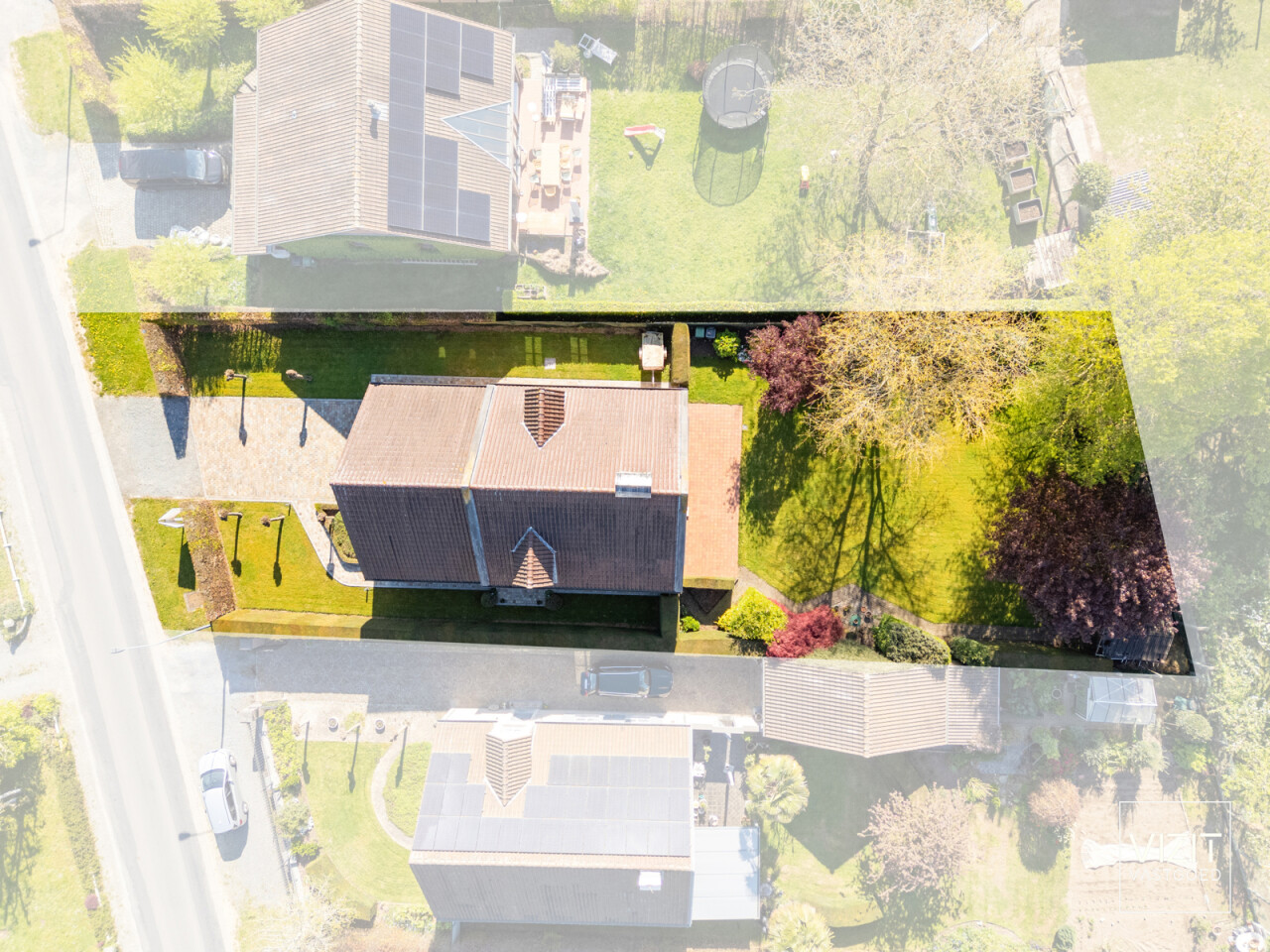 Via de inkomhal betreedt u de royale, lichtrijke leefruimte (48 m²) en de afzonderlijke keuken (20 m²) met aangenaam zicht op de tuin. Vooraan bevinden zich een dubbele garage en een veelzijdige ruimte die perfect dienst kan doen als bureau of extra slaapkamer (14,5 m²).